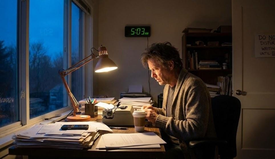 I read about the Haruki Murakami who enters his studio at 5:00 AM and leaves at 11:00 AM. He ignores guests, family, and emergencies to produce his 1,500 words.
