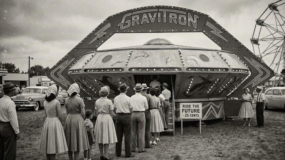 There is a ride at the old carnivals called the Gravitons. You stand inside a metal drum, your back pressed against a padded panel. The music starts—loud, thumping, chaotic. The drum begins to spin. Faster and faster.
